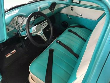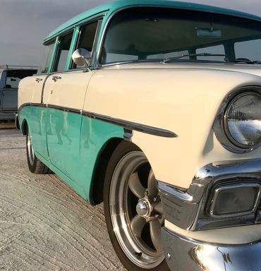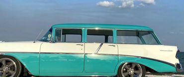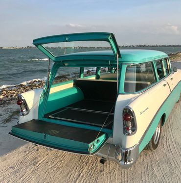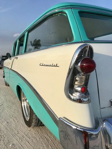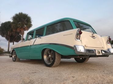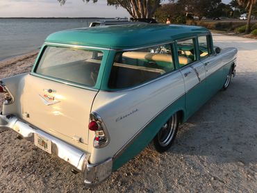 1956 Chevrolet 210 series wagon presented in Tropical Turquoise over India Ivory, with retrimmed matching two tone interior. This wagon is the ultimate beach cruiser and needs nothing unless of course you wish to add a surfboard! Restored and modified a few years ago to a very high standard and has done very little millage since. The paint is near perfect with only a few minor imperfections, rock chips hear and there but overall looks fantastic...if it was just a 10 footer I'd tell you! The wagon runs a 350 SBC motor mated to a 700R4 transmission that changes as smoothly as a hot knife through butter! The motor pulls like a train and does not leak! She sits perfectly on 18'' American Racing wheels, Suspension is by QA1 front adjustable coil overs. Big front sway bar. Exhaust is by X pipe and Flowmasters that give it a great sound. Power Brakes with CAD plated booster supply 4 wheel drilled and slotted rotors and she stops on a dime!
