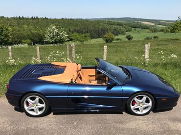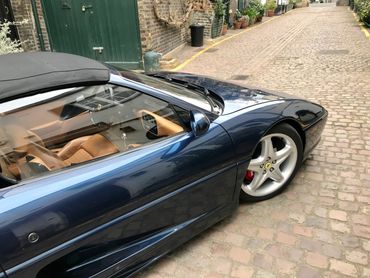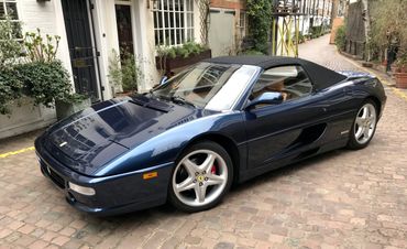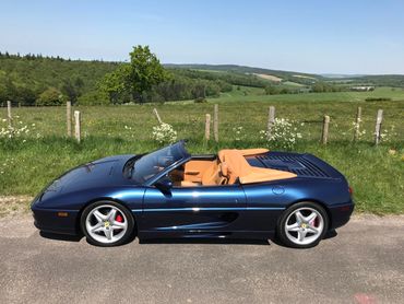 A simply stunning 1995 Ferrari F355 Spider finished in rare Swater Blu with contrasting tan hide interior. Arguably one of the prettiest of Ferrari designs and the last car produced with pop up style headlights. This a first edition Spider with the more powerful Bosch Motronic 2.7 engine management system producing 380 bhp. A desirable six speed manual car, with electrically operated windows,seats, roof, door mirrors and locks. Having covered just 42k miles from new with mainly Ferrari main dealer service history, the car is supplied with its original tool kit, owners manual service booklet etc. The interior is in near perfect order with no ’sticky’ issues or dashboard shrinkage as many of these cars suffer from.